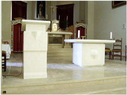 Progetto e realizzazione dell'altare e dell'ambone in marmo Bianco Perlino, intervento scultoreo del maestro Aurelio Nordera. Leggio in legno di faggio sbiancato Pradello di Villimpenta (Mantova), chiesa di San Bartolomeo